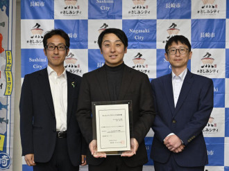 兼子漁具(長崎市三京2)が取り組む、長崎の魚を提供する子ども食堂「みんなのおさかな食堂」が長崎市の「さしみシティプロジェクト」に認定され、3月30日、長崎市役所で認定式が行われた。