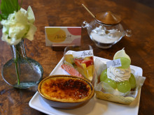 新店舗では半個室のイートインスペースを併設。ショーケースに並ぶシャインマスカットや栗、蜜芋など旬の食材を使ったタルトや注文を受けてからキャラメリゼして仕上げる「クレームブリュレ」(540円)、「いちごショートケーキ」(490円)などのケーキを「コーヒー」「紅茶アールグレイ」「イタリアンソーダ」(以上500円)などのドリンクメニューとともに提供する。焼き菓子にも力を入れ、進物用のギフトセットのほか、「ハロウィンバスケット」(2,400円)など季節に応じた詰め合わせなども用意する。