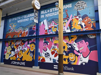 16日、長崎市中心部にあるベルナード観光通りには公式グッズの販売ブースが設けられ、多くのバスケットボールファンが列をつくった。文明堂総本店浜町店(浜町)の向かいにある駐車場の壁には「空き壁アートプロジェクト」によるアート作品が展示され、カメラを手に記念撮影する人の姿もあった。デジタルスタンプラリーの参加店の一つでアート作品のすぐ近くにある「YOPE 長崎店」(浜町)は同ブランドの国内唯一の実店舗。バスケ観戦のついでに立ち寄る買い物客の姿も見られた。同店スタッフは「バスケ観戦で訪れている多くの人に長崎の魅力的なスポットにも立ち寄ってもらえれば」と期待を込める。