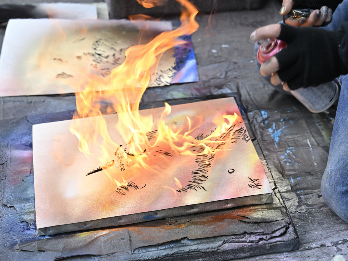炎と「ファイアー」のかけ声とともに作品を描くパフォーマンスが話題になっている