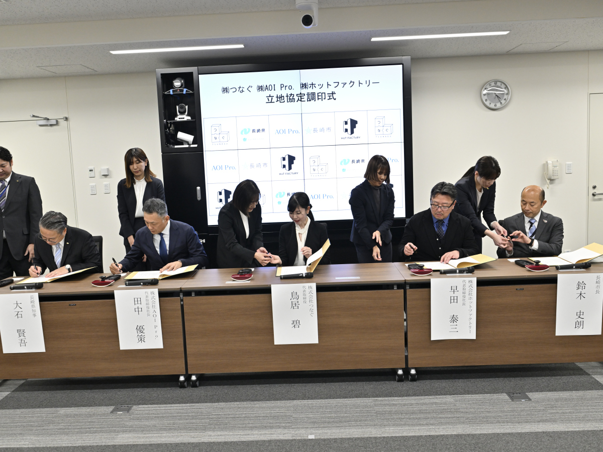 映像制作やIT人材育成を通じて地方創生を目指す「つなぐ」(長崎市目覚町)が12月12日、長崎県庁で大石賢吾長崎県知事や鈴木史朗長崎市長と立地協定を結んだ。