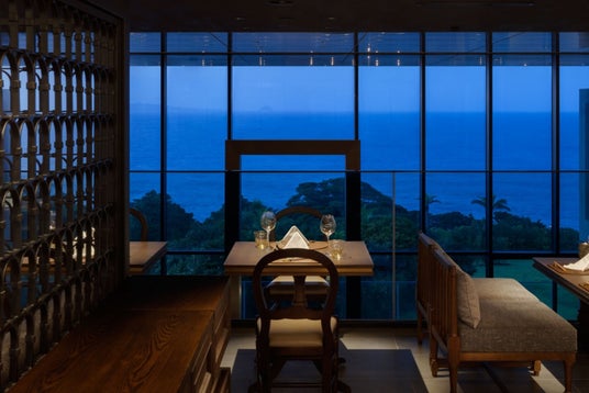 五島のシンボル「鬼岳」の噴火により形成されたとされる溶岩海岸を見下ろす高台に位置しています。内装設計とデザインを手がけた橋本夕紀夫氏がテーマに掲げたのは「The view」。どこまでも続く美しい海景、身体を包み込む海風。鐙瀬ならではのダイナミックで雄大な自然が主役となるようなデザインが、館内にちりばめられています。