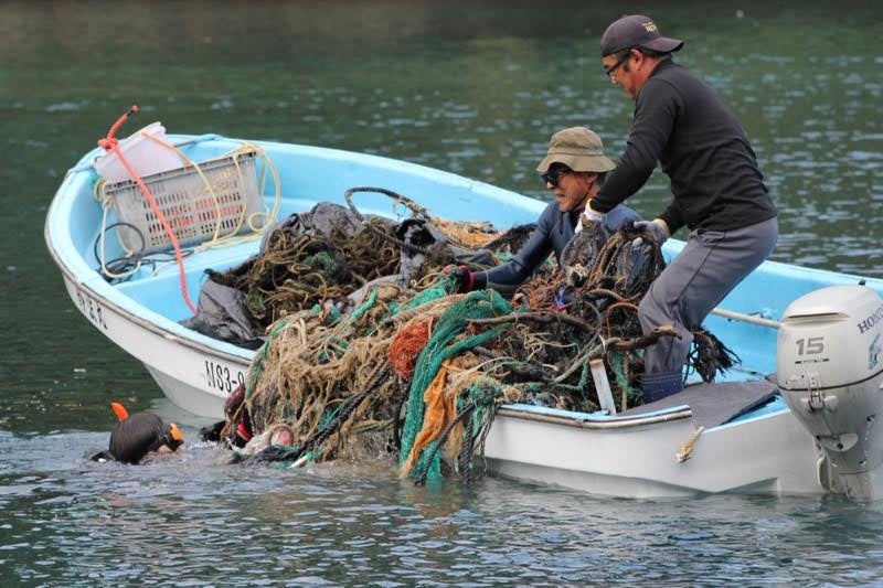 その過程で、沈んだ漁網やロープ類がサンゴを傷つける深刻な状況を確認。2018年から回収を開始し、これまでにクレーンなどを使いフレコンバックで27袋分のごみを撤去しました。