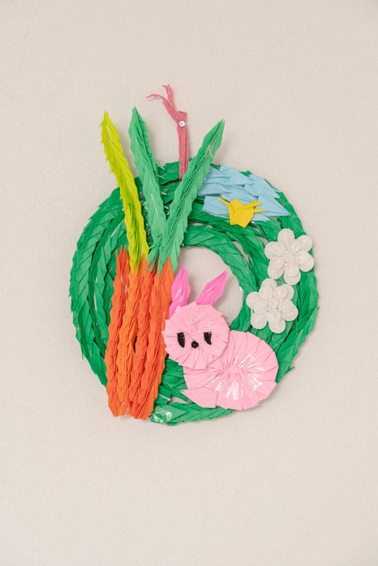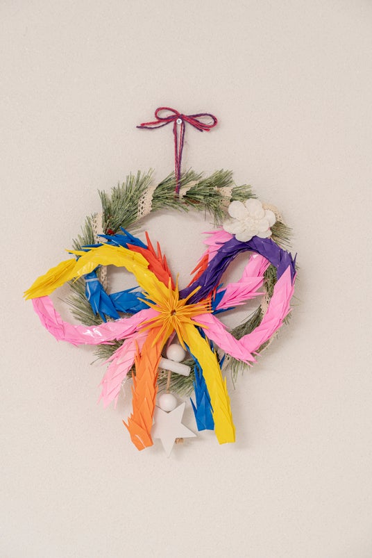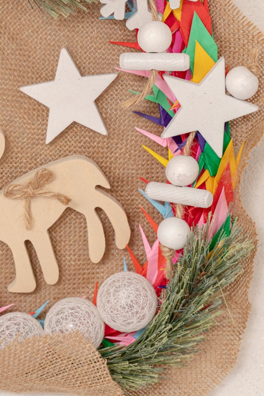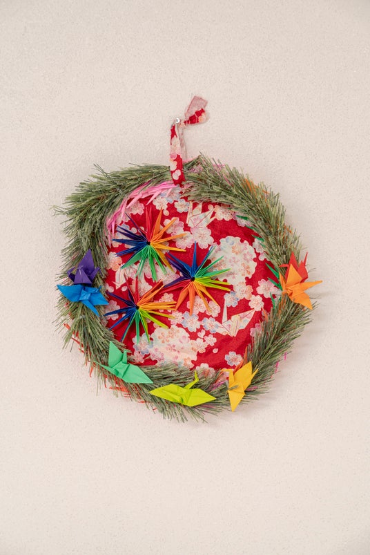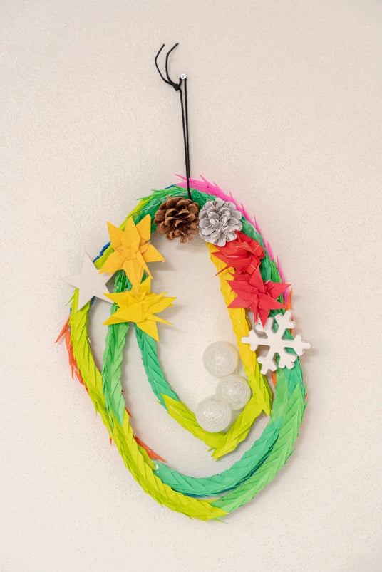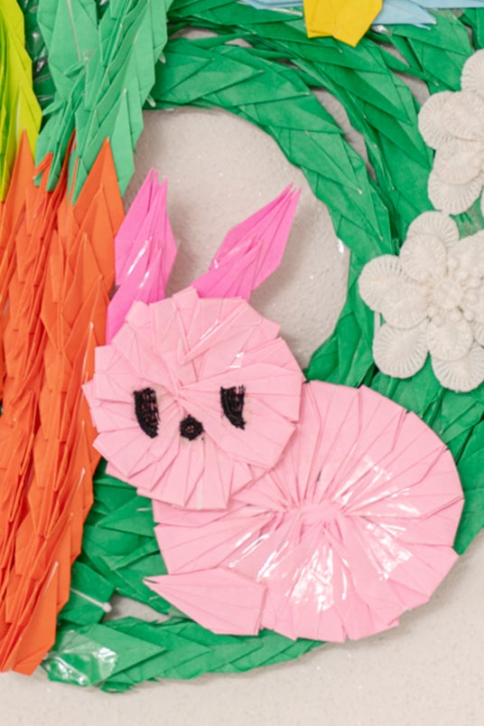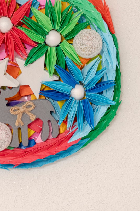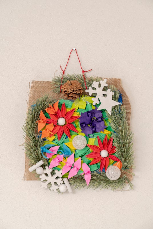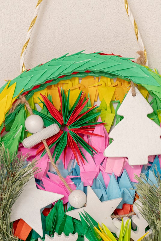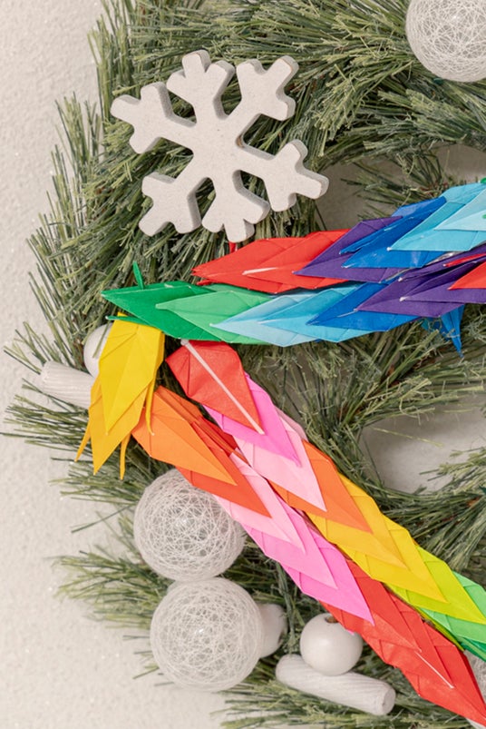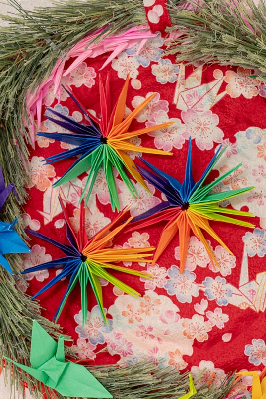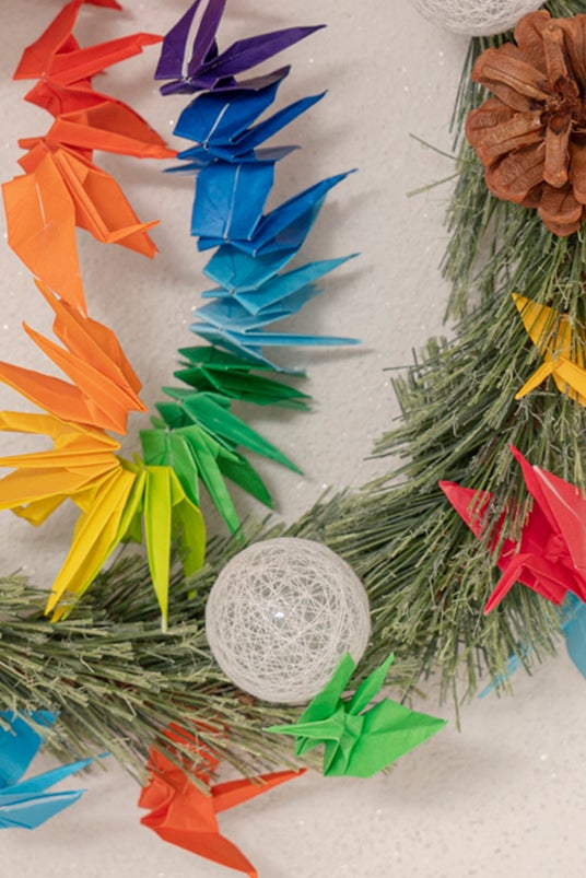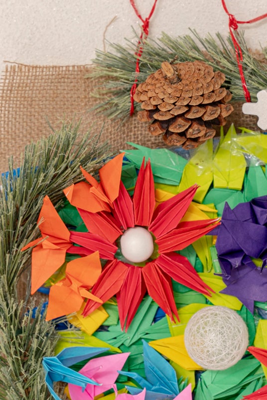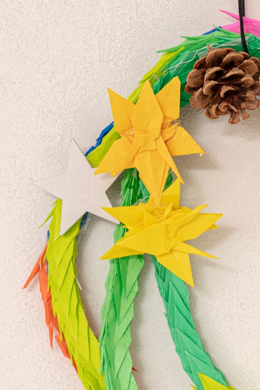 緑色の折り鶴を連ねてリースを形作り、そこに折り鶴を重ねて、黄色と赤色の花を咲かせることで平和なクリスマスの世界を表現しました。