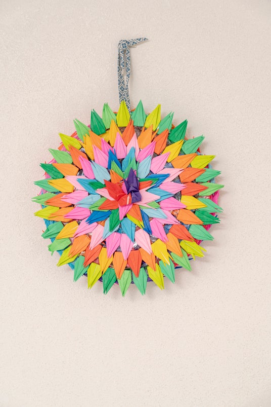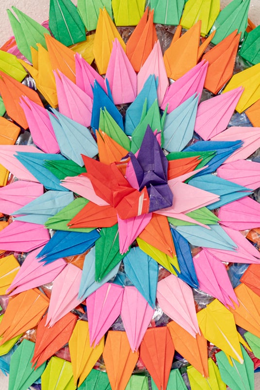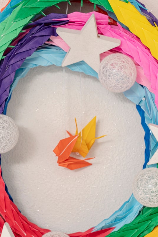 外側をカラフルな折り鶴で囲み、内側には様々なオーナメントを敷き詰めて、多様性に満ちた「平和な世界」を表現しました。