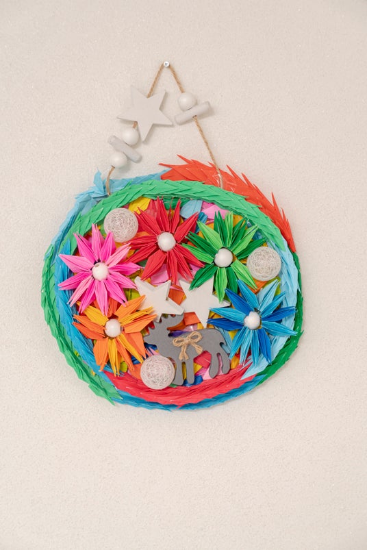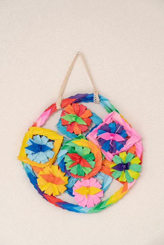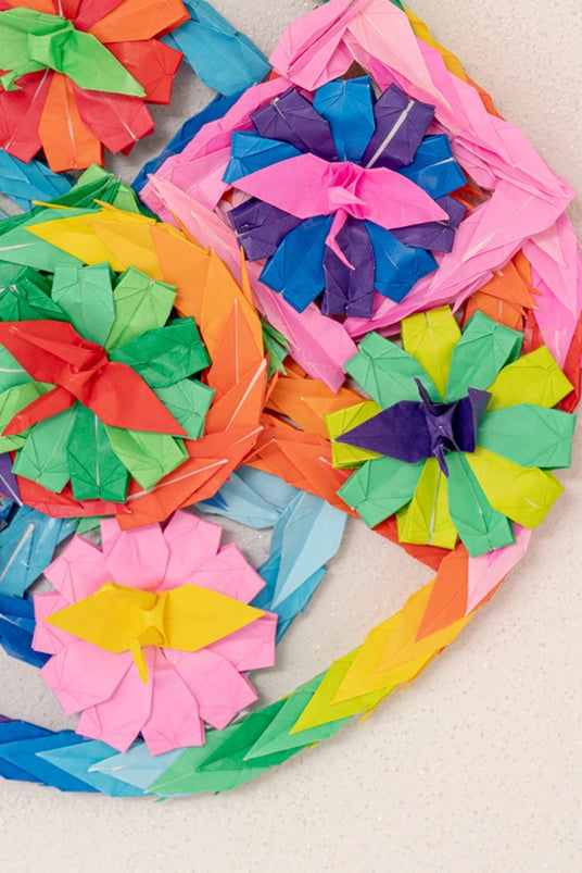 色とりどりの「平和の花」をいくつも作り、それらを集めて一つの大きな輪としました。一つひとつの花の中に必ず平和の象徴「折り鶴」を咲かせ、コミュニティの中心に常に「平和への祈り」が根付いてほしいという願いを込めました。