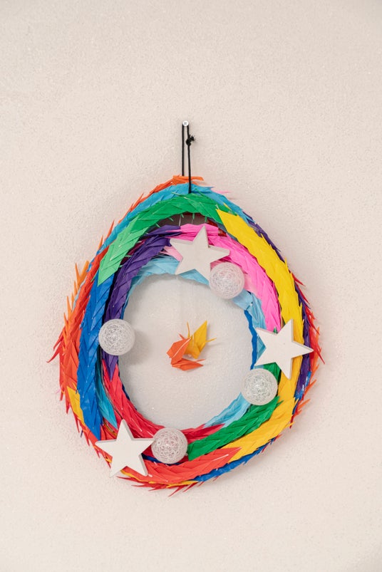 カラフルな外側のリング層は、世界中の多様な人々による「調和の輪」が生まれることを象徴。中央に吊るした二羽の鶴と星々には、希望が未来永劫輝き続けることへの祈りを託しました。