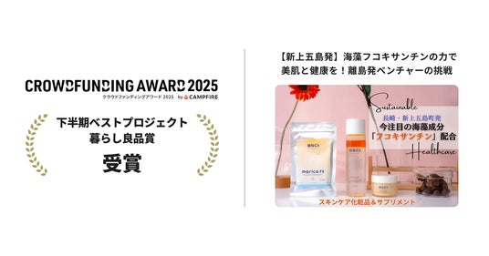 株式会社ブルーサイエンティフィック新上五島(住所:長崎県南松浦郡新上五島町小串郷770番地 代表:柴田 久直)は、国内最大級のクラウドファンディングサービス『CAMPFIRE』が開催する『クラウドファンディングアワード2025 by CAMPFIRE』(以下、クラウドファンディングアワード)において、【下半期ベストプロジェクト・ライフスタイル部門・暮らし良品賞】を受賞しましたので、お知らせいたします。
