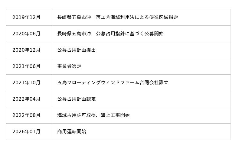 本発電所は、海洋再生可能エネルギー発電設備の整備に係る海域の利用の促進に関する法律(以下、再エネ海域利用法)に基づき、経済産業大臣及び国土交通大臣から公募占用計画の認定を受けた国内第1号の案件であり、複数機設置する商用浮体式洋上風力発電所としても国内初となります。