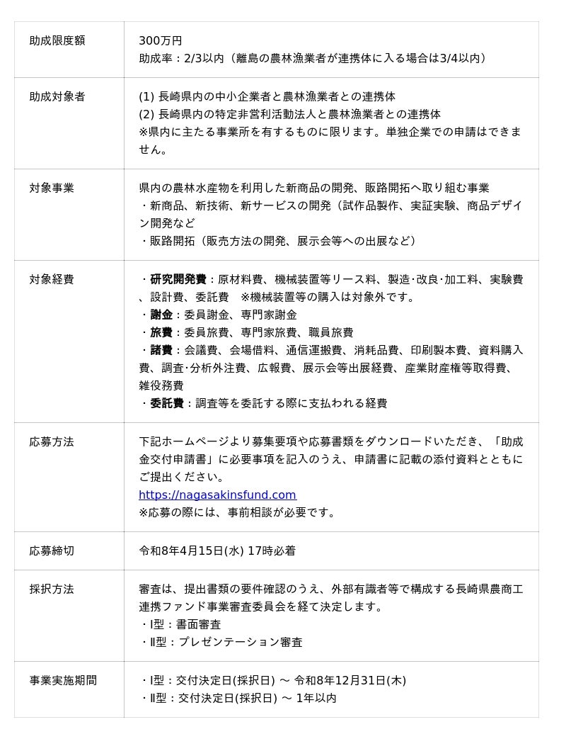 この事業は、長崎県内の品質優良、豊富で多様、かつ安全な「農林畜水産物」等の地域資源と、中小企業等が有する技術開発力や販売力等の経営資源を、両者の連携により新産業の創出や販路拡大に結びつけ、地域経済の発展を図ることを目的に実施しています。 本事業を活用し、様々な新商品が生み出されていますが、この度、令和8年度の募集を開始します。