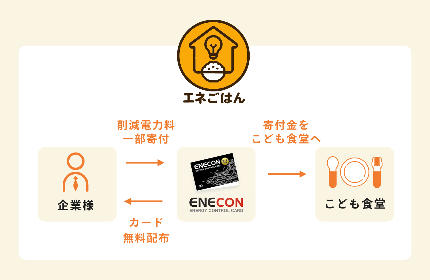 本プロジェクトでは、企業に無償提供する省エネツール「エネコン(R)カード」を活用し、電力使用量の削減を促進。削減された電気代の一部を、地域のこども食堂への寄付として活用します。企業はコスト削減を実現しながら社会貢献に参加でき、こども食堂は継続的な支援を受けることができる、循環型の社会貢献モデルです。