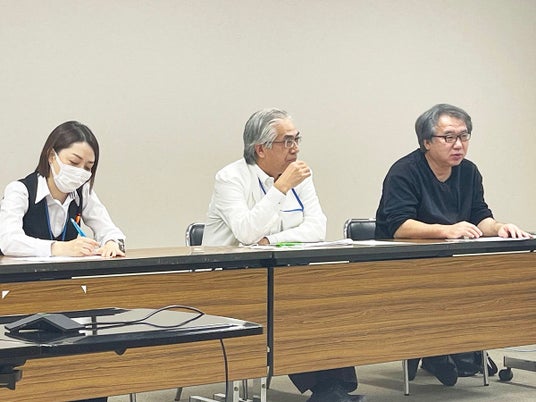 病院の会議における吉岡(右)と八坂貴宏院長(中央)