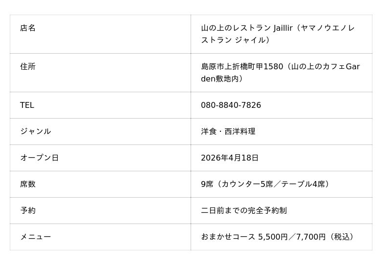 長崎県島原市上折橋町の「山の上のカフェGarden」敷地内に、完全予約制のランチレストラン 「山の上のレストラン Jaillir(ジャイル)」 が2026年4月18日(土)にオープンいたします。