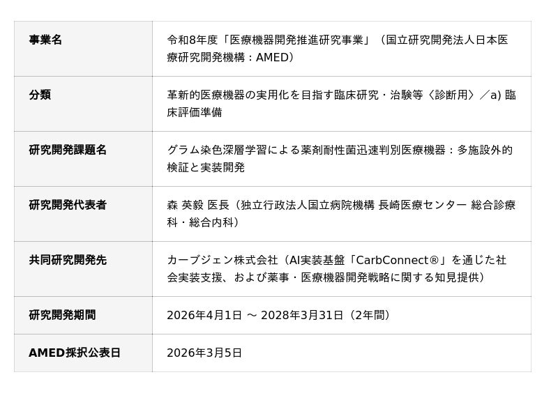 独立行政法人国立病院機構 長崎医療センター(所在地:長崎県大村市、院長:高山 隼人、以下「長崎医療センター」)とカーブジェン株式会社(本社:東京都渋谷区、代表取締役:中島 正和、以下「当社」)は、長崎医療センターが国立研究開発法人日本医療研究開発機構(AMED)の「令和8年度 医療機器開発推進研究事業」に採択された研究開発課題「グラム染色深層学習による薬剤耐性菌迅速判別医療機器:多施設外的検証と実装開発」(研究開発代表者:森 英毅 医長)について、両者で共同研究開発を開始したことをお知らせいたします。