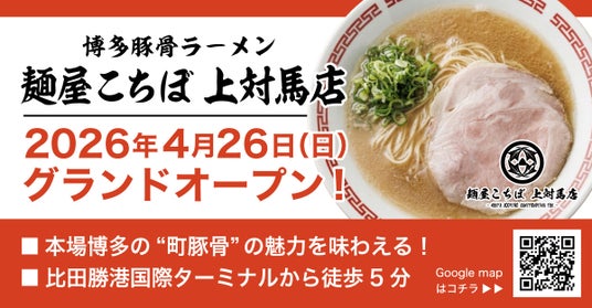 世界10カ国90店舗以上を展開するラーメンのグローバルブランド、博多一幸舎や幸ちゃんラーメンを運営する、株式会社ウインズジャパンホールディングス(所在地 福岡県福岡市博多区、代表取締役社長 吉村 幸助 以下当社)は、株式会社K-code(所在地 長崎県対馬市厳原町、代表 阿比留 幸輝)とプロデュース契約を結び、「博多豚骨ラーメン 麺屋こちぼ 上対馬店」で提供されるラーメンのプロデュースを行い、2026年4月26日(日)にグランドオープンいたしました。対馬市の近くにお越しの際は、本場博多の豚骨ラーメンをぜひお楽しみください。
