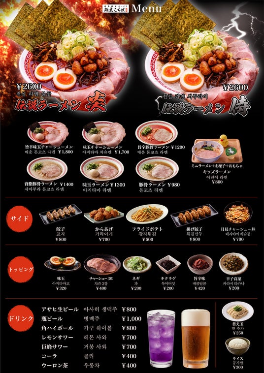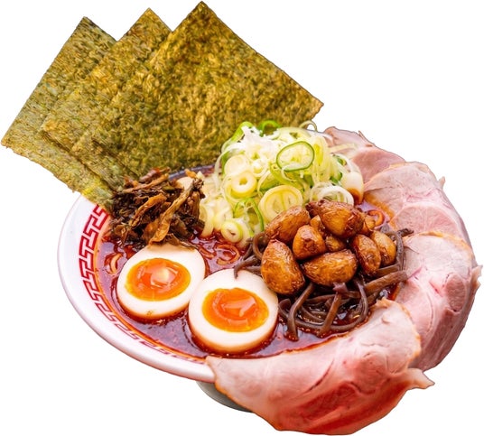 “侍”をベースに、特製の旨辛調味料をふんだんに加えた一杯。辛さだけでなく深い旨みが重なり、濃厚な博多豚骨スープにさらなる奥行きを生み出します。日本と韓国、二つの食文化が交わる対馬だからこそ生まれた味わいです。一口目から身体の芯に火が灯るようなインパクトと、後を引くコクが特徴です。チャーシュー、のり、味玉、きくらげ、辛子高菜、揚げニンニクを贅沢に盛り込み、それぞれの旨味・食感・香ばしさが幾重にも重なります。旅の高揚感をそのまま味にした、ここでしか出会えない一杯です。
